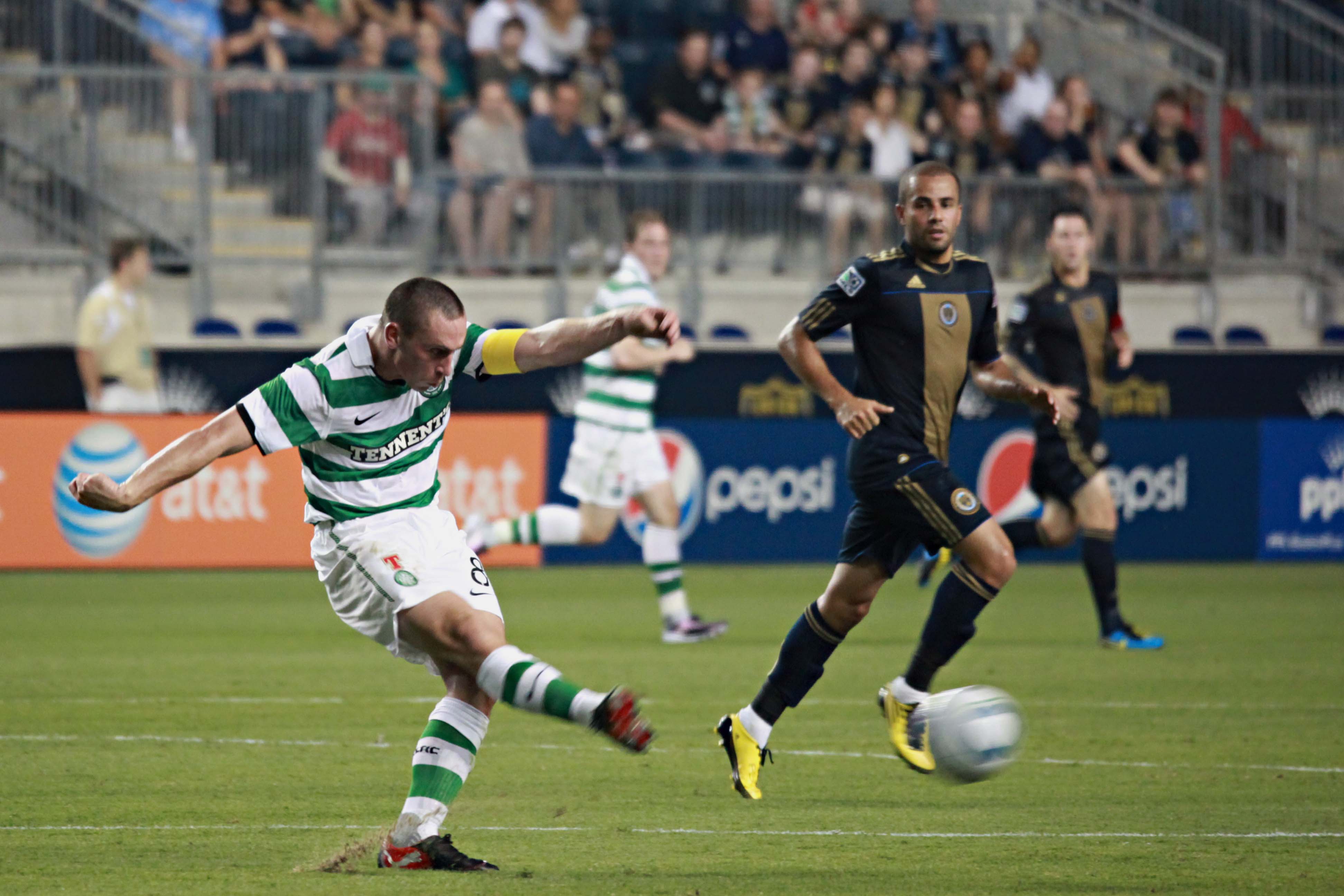 Of course, there’s also the strong play of Danny Mwanga and the man of mystery for most of the night, Eduardo Coudet, the former River Plate, and, most recently, Atletico Colón player whose signing the Union are set to announce. Mwanga nearly opened the scoring himself around the 5th minute; showing strength on the ball, he was taken down near the spot on a hard, yet clean tackle, though he nearly put it away as he fell. On an ensuing corner he nearly made amends, and throughout the remainder of the match he continued to harry an overwhelmed Celtic squad that was clearly feeling the pressure of facing an in season squad.