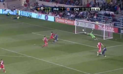 But Chicago had little coherence in possession themselves, and it was the Union who continued to threaten Johnson’s net. Fighting off three men in the center of the pitch, Farfan released Cruz down the right flank, where he was finding plenty of space against the heavy-footed Dan Gargan, who replaced suspended fullback Gonzalo Segares. Cutting into the box, Cruz’s sharp-angle shot forced a save from the Fire keeper, pushing the ball around his far post.