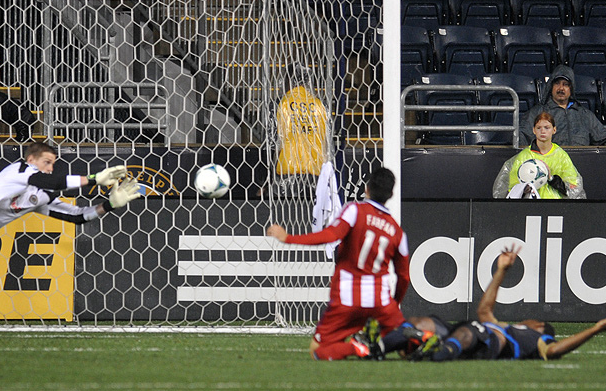 To be honest, I was jumpy. There was one corner in the first half, I think it was taken by Le Toux, that hooked. I thought it was coming towards my face, and I backed up. It actually went to someone’s head — Casey’s, I think — and it slammed into the boards in front of me. I swear I jumped more than a rabbit! Kennedy came over, and I wasn’t sure if he wanted the ball I had or the one laying on the ground. I gestured to him with my ball, but he waved me off and got the ball from the ground.