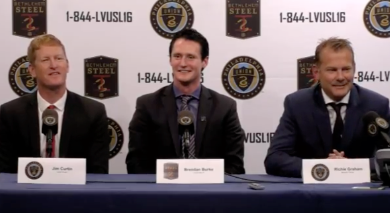 Transcript and video of Brendan Burke’s unveiling as the head coach of Bethlehem Steel FC. Includes comments from Union head coach Jim Curtin and minority owner Richie Graham.